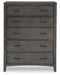 Cool and clean, yet warm and inviting. This chest of drawers has so many standout qualities, making it an inspired choice for your dream destination. A prime example of “casual contemporary” style at its very best, the designer piece is dressed to impress with an embossed wood grain texture. Spacious drawers with fully finished interiors offer ample storage for your wardrobe and spare bed linens. And the medium gray-brown finish with a blackened wood grain is wonderfully easy on the eyes.
